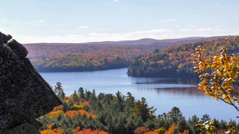 アルゴンキン州立公園は、カナダで最も古い州立公園であり、メープル街道の一部として紅葉の名所でも知られています。秋には真っ赤なカエデの葉が公園全体を覆い、訪れる人々を魅了します。
