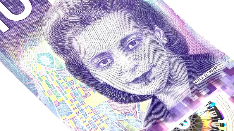 紫色のお札。2018年からはカナダ・ノバスコシア州出身の黒人女性実業家、ヴァイオラ・デズモンドが描かれています。カナダで初めて、カナダ人の女性の肖像画が紙幣に採用され、さらに黒人女性としても初となりました。デザインも、初の縦位置を採用しています。