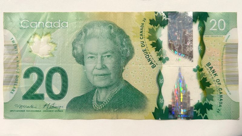 緑色のお札。イギリスの女王であり、カナダの主君でもあるエリザベス2世女王が描かれています。裏面には、フランスにあるカナダ国立ヴィミー記念碑が描かれています。