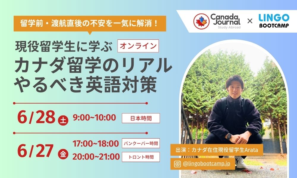 そんな不安を解消するために、カナダジャーナルと英語学習アプリ塾「リンゴブートキャンプ」が共同で特別オンラインイベントを開催!60分で、渡航前のモヤモヤをスッキリ解消します!