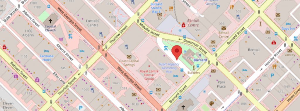 バンクーバー市内中心部の集合場所は、スカイトレインのBurrard(バラード)駅 を地上に出てすぐのところにある、Hyatt Regency Hotel近くのMelville Streetです。