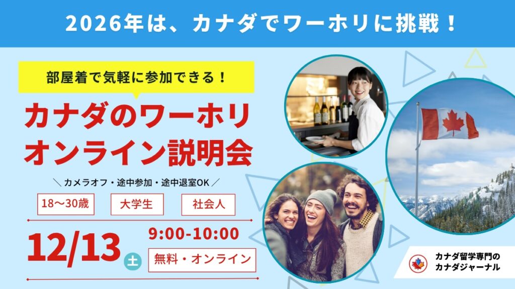 カナダ現地の留学エージェント「カナダジャーナル」が、日本時間の12月13日(土)9時から、2026年のワーキングホリデー説明会をオンラインで開催します。