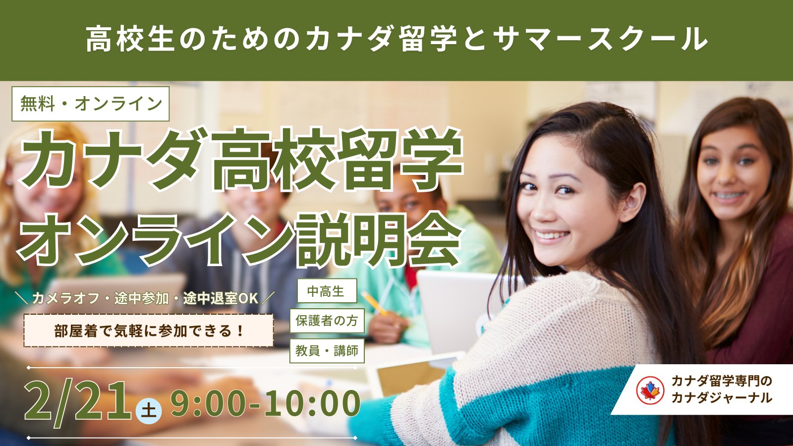 カナダのバンクーバーにある留学エージェント「カナダジャーナル」は、日本時間2月21日(土)9時より、カナダの高校留学について徹底解説するオンライン説明会を開催いたします。