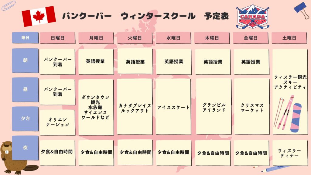 上の表は1週間のスケジュール例です。実際のプログラム内容は学校やコースによって異なりますが、アクティビティは複数の種類から選択できる場合もあります。土曜日は終日アクティビティが行われ、観光や遠足などを通してカナダの文化を体験できる日です。日曜日に帰国というスケジュールになります。